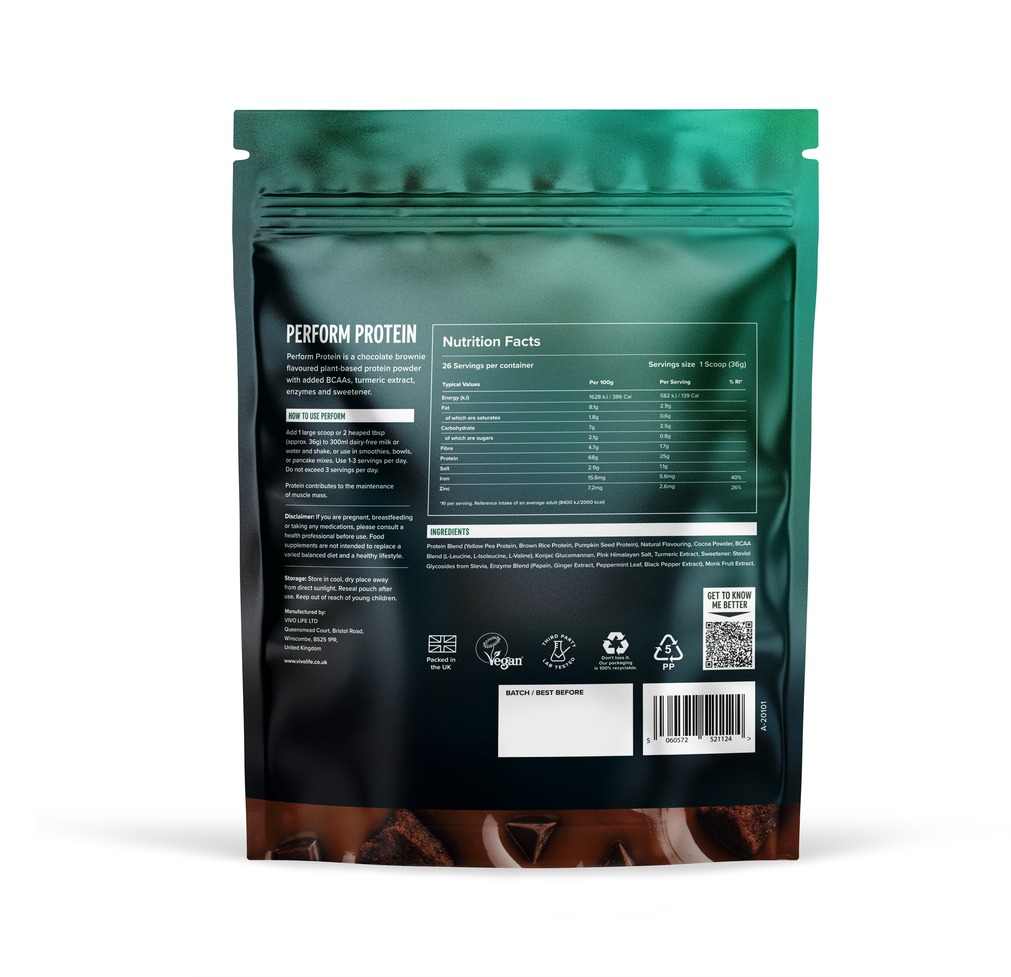 - Vivo Life PERFORM Hágæða Plöntu Protein & BCAA 936 gr - 26 skammtar